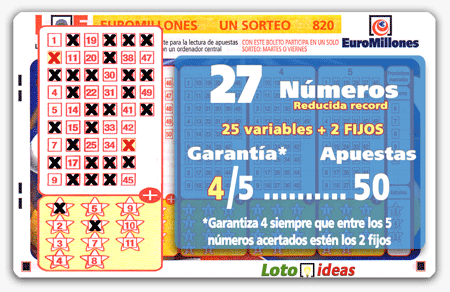 Combinación de 27 números (25 variables + 2 fijos) en reducción al 4 para Euromillones.